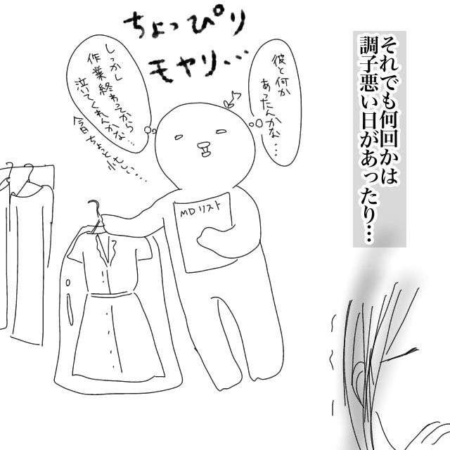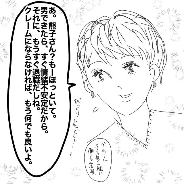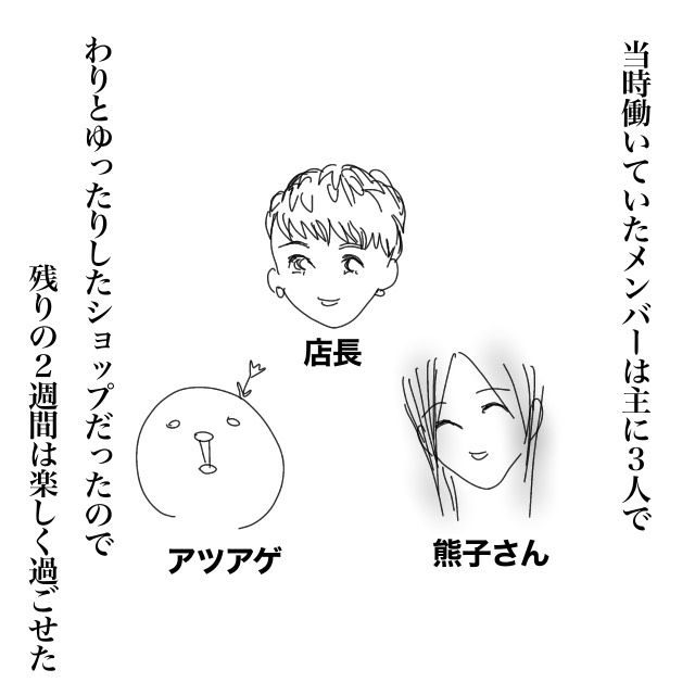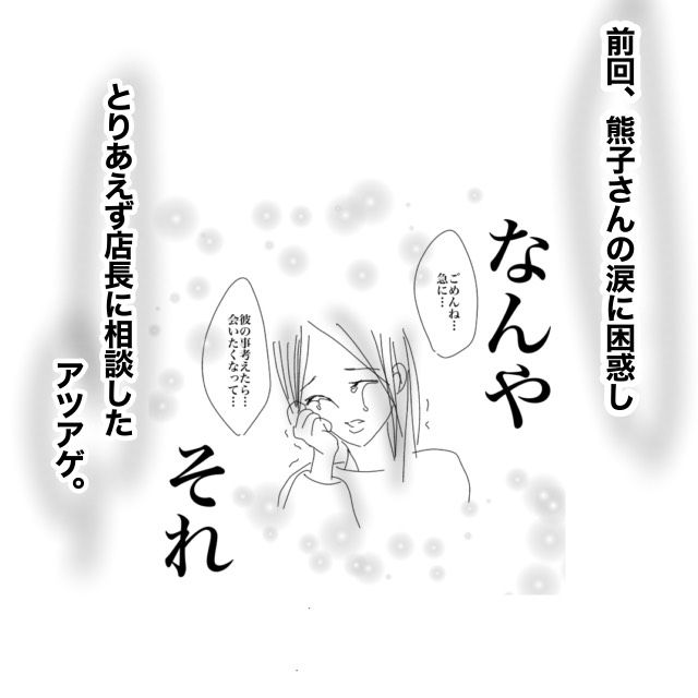 付き合って2ケ月で「1秒も離れたくない」という熊子さん、若干の違和感を感じつつ「すごいですねー!彼氏さん愛されてますねー」と必死にリアクションしたところ、突然仕事中の店内で「彼の事考えたら泣きたくなって・・」と涙を流す熊子さんに「遠距離なんですか?」とたずねると、通い妻だと言われ、「もう店長に言お」と心に決めたアツアゲさんなのでした・・。