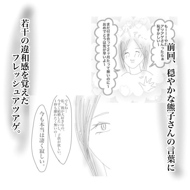 15年位前に仕事先の先輩として出会った熊子さん、新しいショップに異動となり、交代で退職する熊子さんと過ごした約2週間、話しやすくて良い先輩だと思っていた熊子さんに退職の理由をたずねたところ、「彼氏が転勤だからついて行く」と聞き、「おめでとうございます!」と伝えると「まだ付き合って2ケ月」だと言われ「・・早くない?」と驚くアツアゲさんにかまわず「1秒も離れたくない・・」と言う熊子さん・・