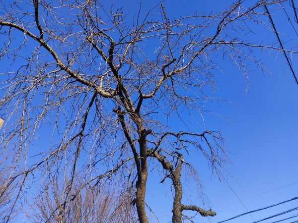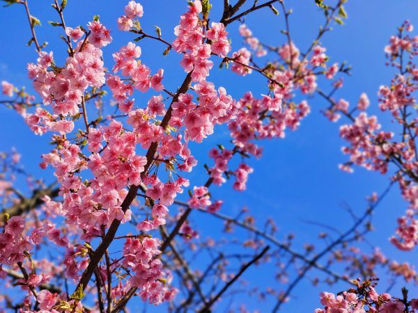 2月下旬、河津桜が咲いていました。濃いピンクが愛らしく、青空に映えています。(2024年2月24日 高津区北見方3丁目付近)