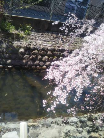 川面まで垂れ下がり水面に写る美しい桜 (2023年3月 高津区二子5丁目付近)