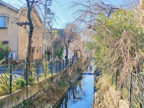 二ヶ領用水沿いには約340本のソメイヨシノ、河津桜、八重桜が所々に並び、神奈川県内6位の人気の高いお花見スポット。濃いピンクに色づいた垂れ桜が多く見られるのが特長です。