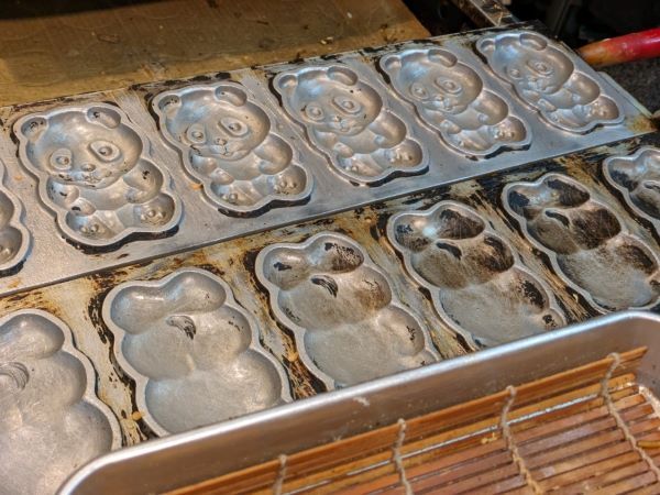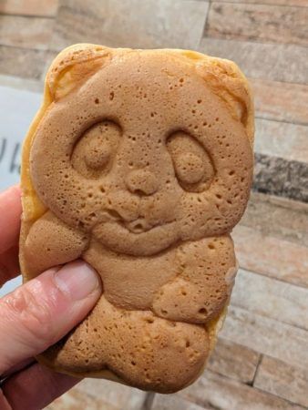 可愛いですね~、パンダの型。パンダ好きにはたまりません。 実は20年前にお店をオープンした時は、福岡でソウルフードとして親しまれている「むっちゃん万十」を売っていました。しかし10年くらい前に、むっちゃん万十で使っていたムツゴロウの型が古くなって使えなくなってしまっため、パンダの型を使用することにしたのだそうです。マヨネーズなどの中身は、むっちゃん万十と同じです。 出来上がりました~!パンダです!