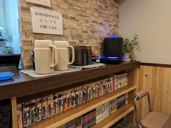お水はセルフ、マンガもあるのでほっと一息するにもぴったり。