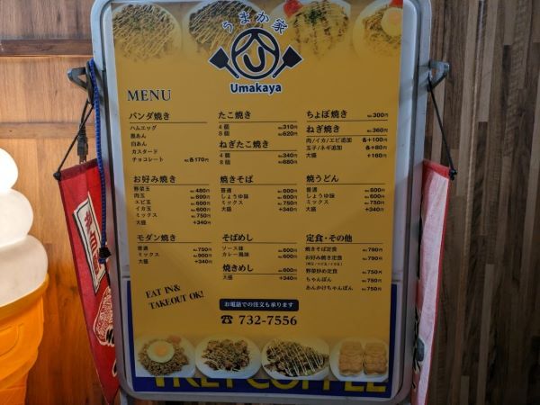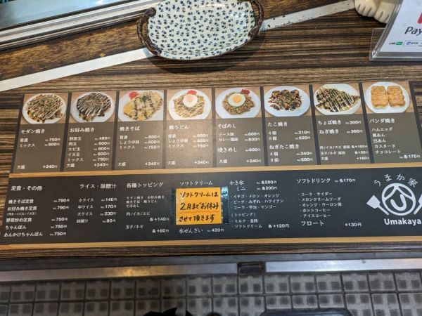 メニューのラインナップはご覧の通りで、お好み焼きや焼きそば、やきうどんにそばめし、たこ焼きなど、気軽に食べられるものが多いです。そして麺類はソースが選べたり量が選べるので、味の種類もかなり豊富ですよね。因みに右から2番目の「ちょぼ焼き」とは、薄い小麦粉の生地に野菜などを入れて焼いた、お祭りの時にお馴染みの「箸巻き」のようなものだそうです。