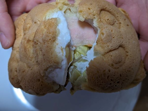 ふわふわのカステラのような生地を割ってみると、半熟の卵が丸ごと一つと千切りのキャベツとハム、そして濃厚なマヨネーズと大好きなあの組み合わせです。それらの具とほんのり甘い生地を一緒に頬張ると、幸せ~♪