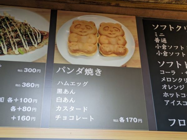 「パンダ焼き」です!福岡の方なら一番上に書かれた「ハムエッグ」にピピーンとくる方も多いかもしれませんね♪早速そのお味をオーダーして、色々お話をお伺いさせていただきながら、焼きあがりを待ちます。