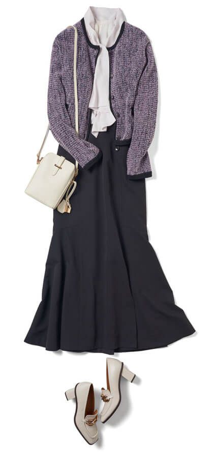 カーディガン¥20,900/CELFORD ボウタイブラウス¥17,600/アプワイザー・リッシェ マーメイドスカート¥17,600/リランドチュール バッグ¥5,390/カシュカシュ(アンビリオン) パンプス¥24,200/銀座かねまつ(銀座かねまつ6丁目本店)