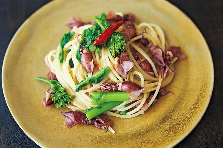 ホタルイカは小さいけれど、旨味の宝庫。一緒に炒めることで、菜の花もイカのおいしさをまといます。酒肴家として有名な料理研究家の稲垣知子さんに、日本酒と相性抜群なパスタレシピを教えてもらいました。