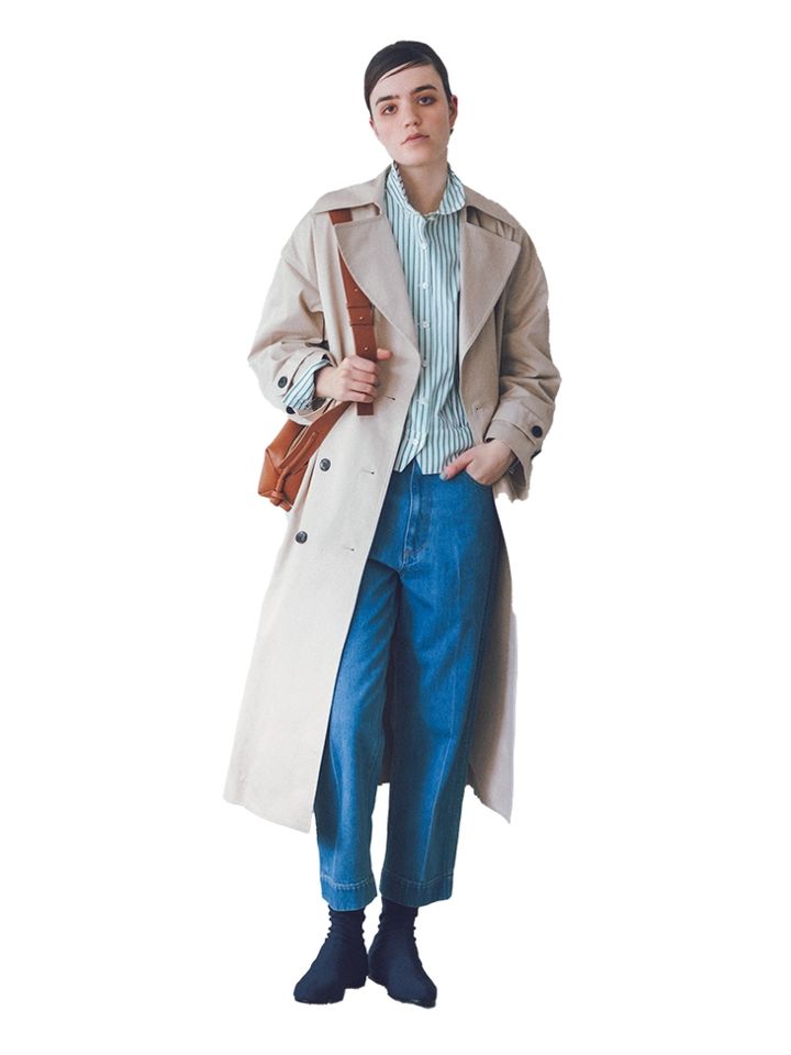 きちん感のあるトレンチに合わせて、デニムもクリーンなもの選ぶことが多かったこれまで。形はそのまま、あえてやぼったさが残るデニムを合わせると、心地よさが求められる今にフィット。