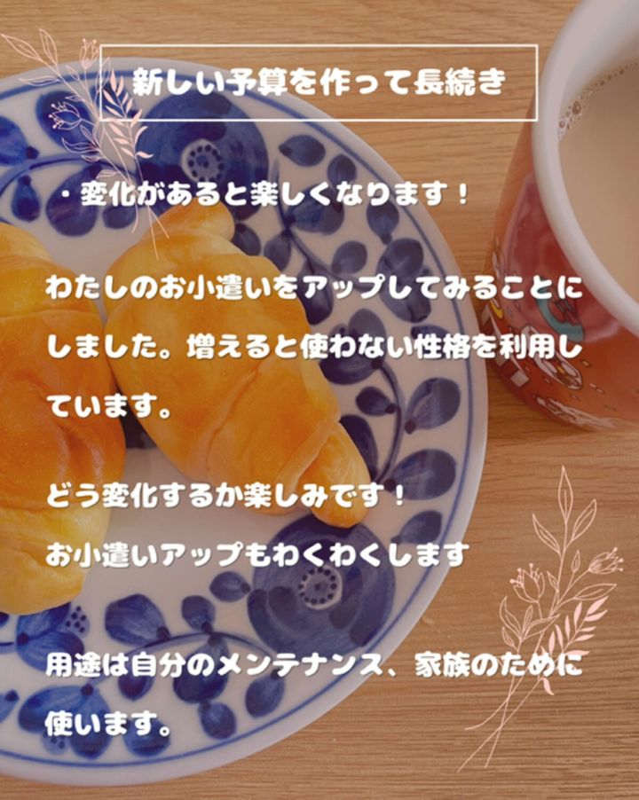 お小遣いの内訳は家族のほしいもの、自分のメンテナンス品を買う予定です。今までだと雑費などから必要に応じてお金を使っていて、予算オーバーすることが多くありました。今回から自分のお小遣いを増やし、その中から費用を捻出することで家計にどう変化するか試してみたいと思います。