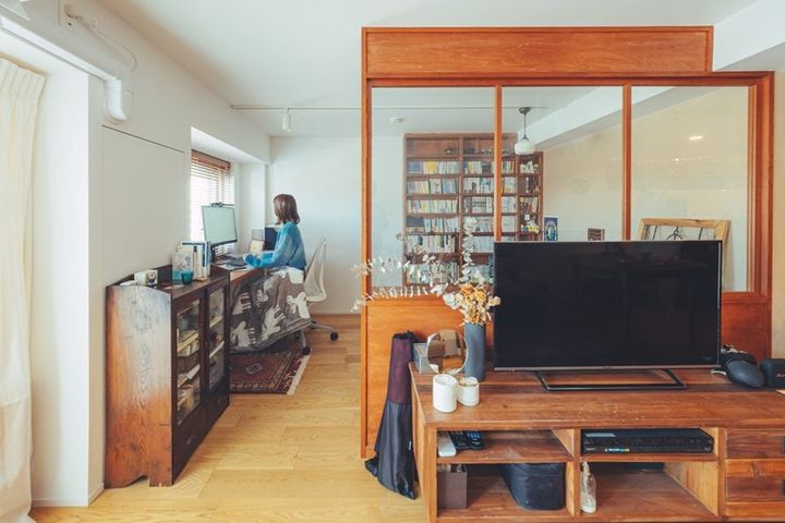 「前の家で本棚の見た目の圧迫感や本の文字や色による情報量の多さから、忙しなさを感じてしまうことが悩みだったので、リビングから見たときに視線がある程度遮られるよう室内窓で仕切っています」