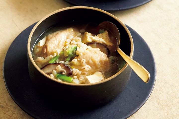 もち麦は、食物繊維やたんぱく質などが豊富でヘルシー。スープに入れれば炊かずにすみ、簡単。鶏手羽中はうまみが強い半面、脂質が多くてたんぱく質が少なめなので少量にし、植物性たんぱく質の豆腐を合わせて、カバー。