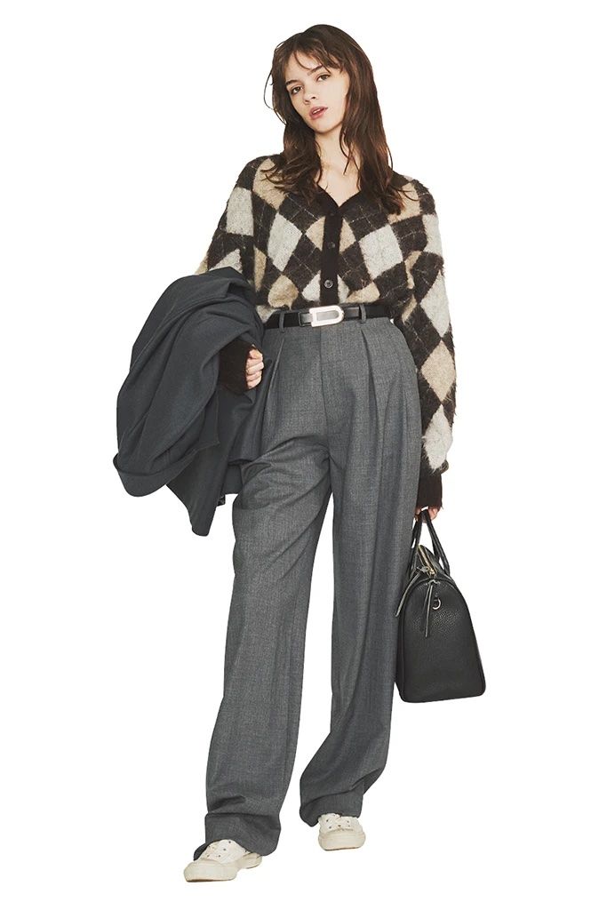 アーガイル柄カーディガンは着まわし。チャコールタックパンツ 42,900円/ソブ、黒ベルト 22,000円/ダブルスタンダードクロージング (ともにフィルム) 手に持ったコート 37,400円/メゾンスペシャル(メゾンスペシャル 青山店) 黒ボストンバッグ 16,940円/ぺルケ(アンビリオン) 白スニーカー 11,000円/ムーンスター(ムーンスター カスタマーセンター) しなやかな生地はタックインしてももたつかない。