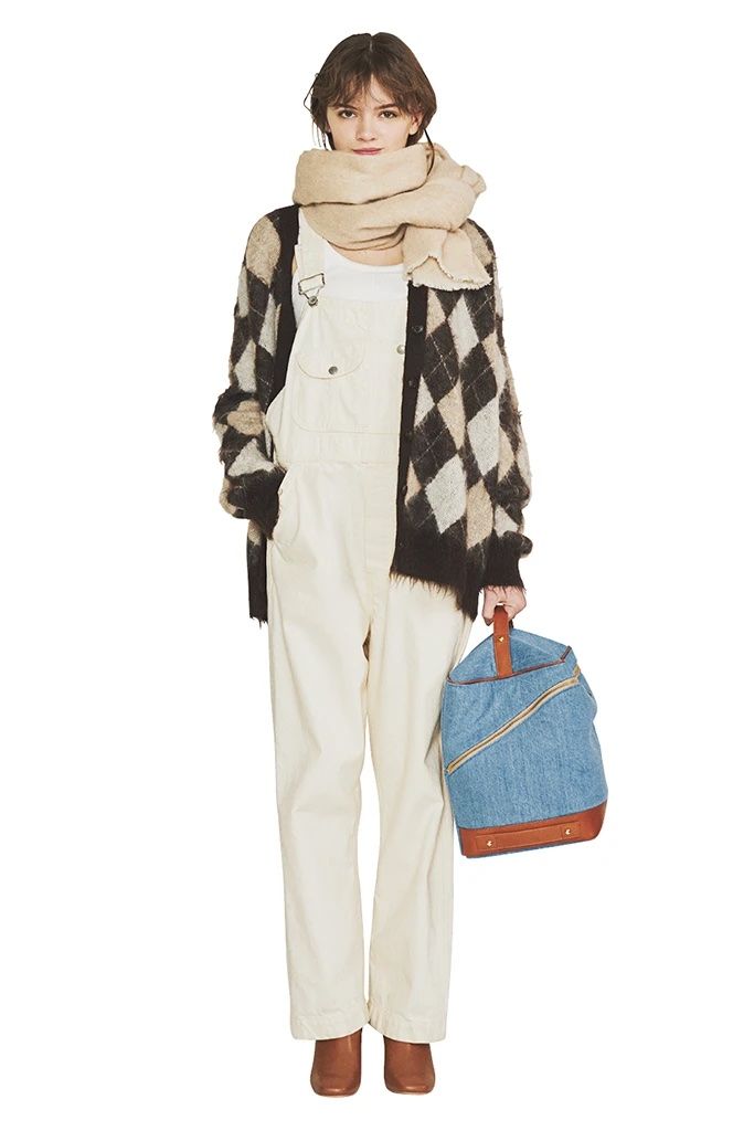 アーガイル柄カーディガンは着まわし。アイボリーオーバーオール 31,350円/OMNIGOD(ドミンゴ) 白カップつきリブタンクトップ 10,450円/ソブ(フィルム) ベージュストール 48,400円/アソース メレ、デニムバッグ 44,880円/メイ トゥエルブ(ともにアイネックス) キャメルスクエアトゥショートブーツ 27,500円/ダイアナ(ダイアナ 銀座本店) 柄が自然になじむよう、同系色のストールも投入。