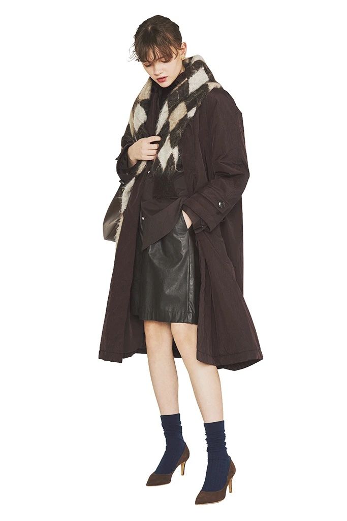 アーガイル柄カーディガンは着まわし。コート 26,180円/M_MOUSSY(バロックジャパンリミテッド) シャツ 17,600円/バビロン(バビロン新宿) 中に着たタートル 42,900円/コズ マニュファクチャード バイ ラッピンノット(ウメダニット) レザーハーフパンツ 29,700円/SACRA(インターリブ) ゴールドピアス 11,550円/SOKO(ZUTTOHOLIC) ネイビーソックス 3,960円/SWEDISH STOCKINGS(エディット フォー ルル) バッグ 27,500円/クリスチャンヴィラ・ペル・アルアバイル(アルアバイル) パンプス 17,050円/ダイアナ(ダイアナ 銀座本店)