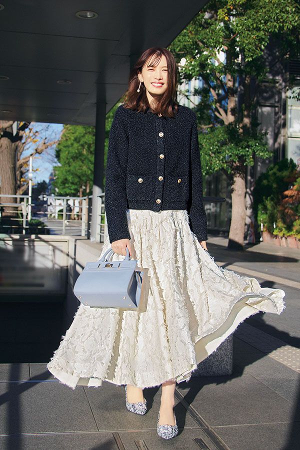 シックな黒カーデは、光を受けてきらめくラメ混。風にふわりと膨らむスカートは、フリンジで飾られた表面感に今年っぽいシャレ感が。上下とも旬な合わせを、知的なモノトーンで通勤仕様に。