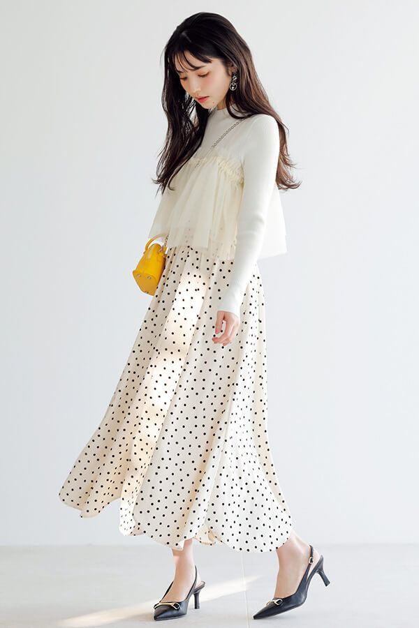 秋冬から引き続きトレンドインしているドット柄は、春らしいチュールキャミをレイヤードして最旬に♡ 鮮やかなイエローのミニバッグを斜め掛けして、ハッピー感も忘れずに。