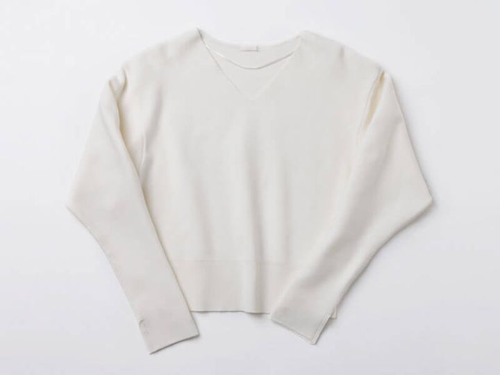 プチプラとは思えない、もちっとした厚手のニット。立体的な編み地でつくられたふくらみのある二の腕まわりと、袖口に向かって細くなるフォルムのメリハリが今っぽい。デコルテがきれいに見えるVネックも高ポイント♡