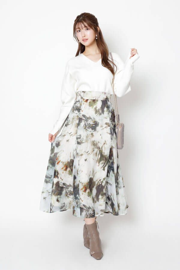 そろそろマンネリを感じてくる花柄スカート×ブーツの冬コーデを、春っぽさを感じる白ニットを取り入れて爽やかに。シックな色のスカートを、明るく華やかな印象に導いてくれます♪