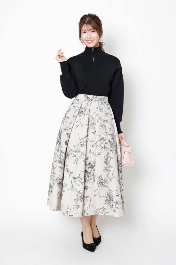 厚地でハリのある素材&繊細な花柄のスカートで、プチプラトップスをリッチに昇華♡ ジップを閉じれば、タートルネックの感覚で着られてコーデに迷わないし、暖かさもしっかり。
