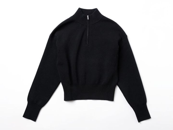 トレンド継続のハーフジップトップス。カジュアルが苦手なフェミニン派でも、黒を選べばきれいめに着られます。ほどよいクロップト丈でボトムを選ばないから、トレンドアイテムでも着回し力抜群!