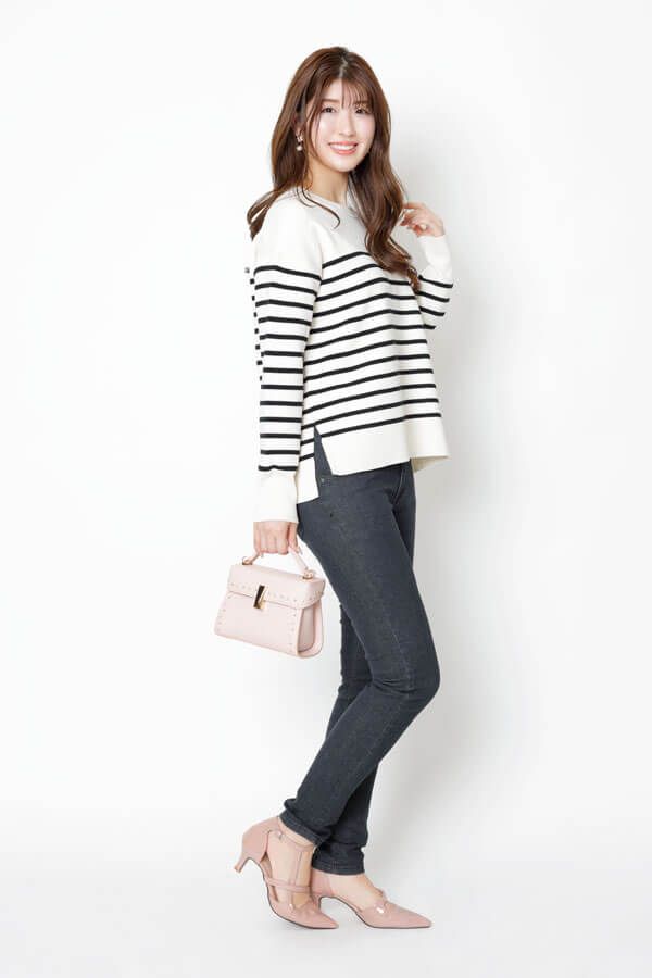 ボーダー×デニムの定番コーデは、カチッとフォルムのピンクバッグ&ツヤのあるパンプスで、春らしさとリッチ感を添えるのがレディ流。パンプスは肌面積が多めになるデザインで抜け感を出してこなれた雰囲気に。