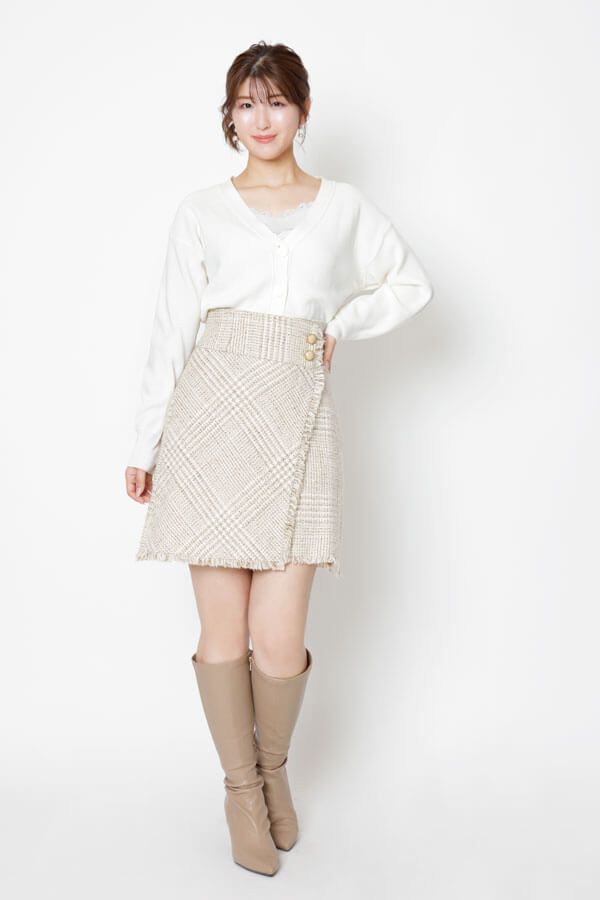 冬は前を閉じてトップスとして着用。薄手素材で軽やかなカーデなので、ツイードスカートとロングブーツとの合わせで冬ムードに寄せて。インナーをタートルネックなどに変えて防寒重視にしてもおしゃれにまとまる!