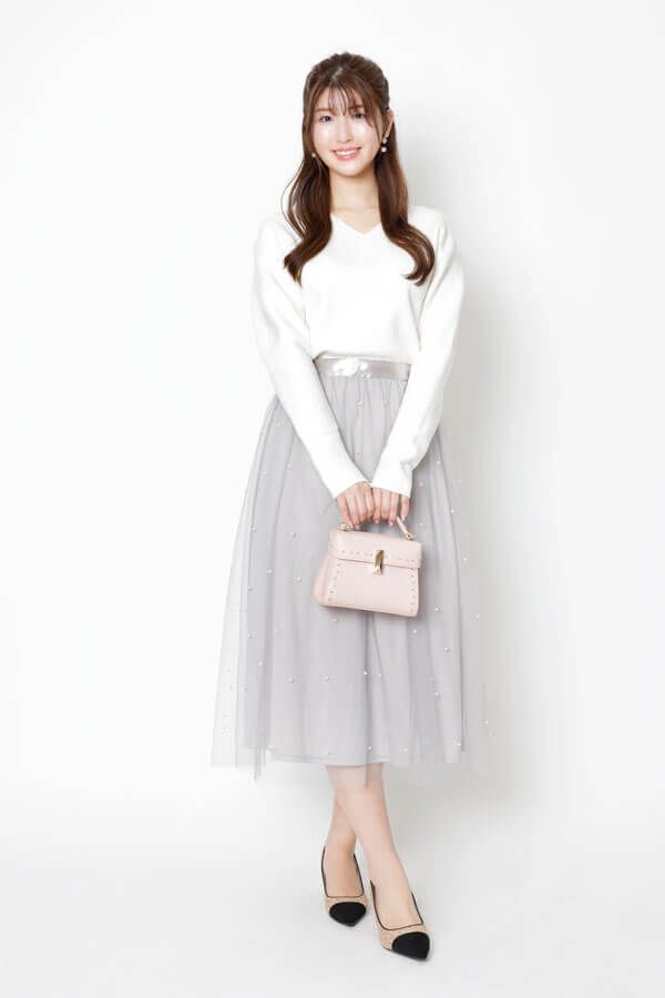 チュールスカートを合わせて、春らしい軽やかさとトレンド感をプラス。脇下がすっきりしたシルエットだから、タックインしてももたつきません。白×淡グレーがのっぺり見えないよう、足元は黒のバイカラーで引き締めて。