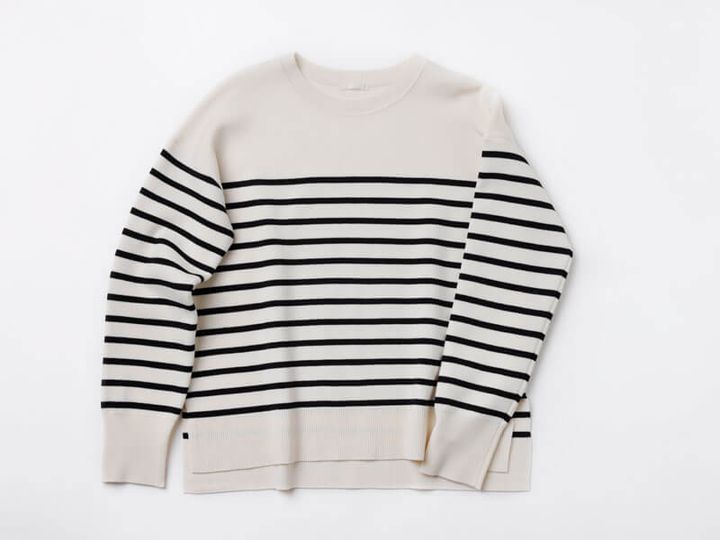 凹凸の少ないクリーンな表面感が高見えを誘うクルーネックニット。細めボーダーとサイドスリットのおかげで、きれいめコーデにも合わせやすい♪ ゆとりのあるサイズ感が華奢見えを叶えてくれます。