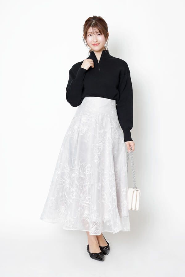 春になったらジップを開けて着て、抜け感出しを。軽やかな白スカートで春っぽさを添えつつ、モノトーンでまとめることで、カジュアルなトップスをレディ好みに着こなせます。