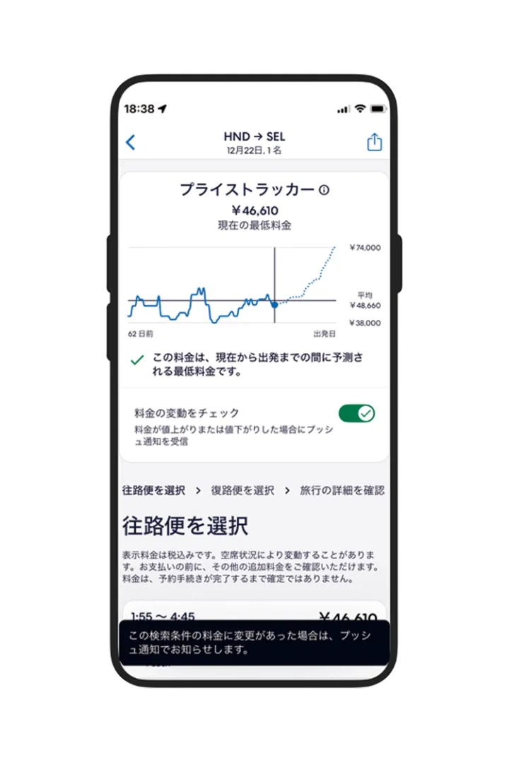 AIと機械学習機能を活用し、旅行者が検索しているルートの航空券の価格が上下した際に、アプリ上でプッシュ通知を送信してくれる機能が登場。