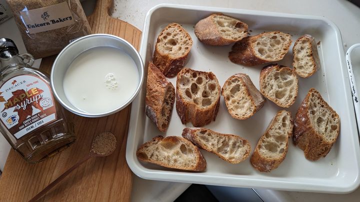 大きいバットにフランスパンを全部並べたら、卵液をかけて下半分を浸します。メープルシロップをパンの1つ1つに少し垂らします。裏表最低5分ずつ漬け込んだら、バターをたっぷりひいたフライパンで両面こんがり焼いて完成です!