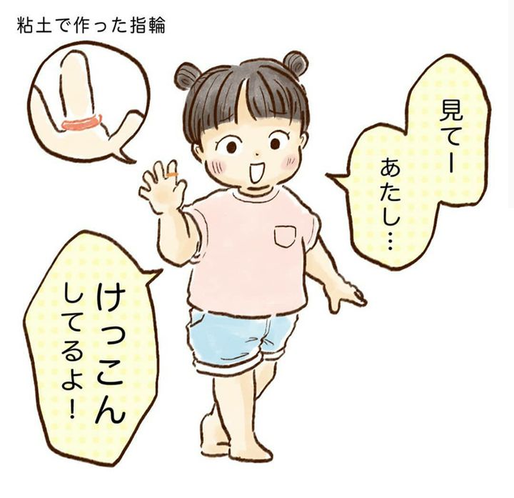 少し前から私の結婚指輪を見て気になっていたようで、「結婚したらする指輪だよ」と教えてから、自分でも指輪を作って結婚ごっこをしていました。長女のかわいらしい指輪から、まさか駆け落ちというシリアスな話になるとは…