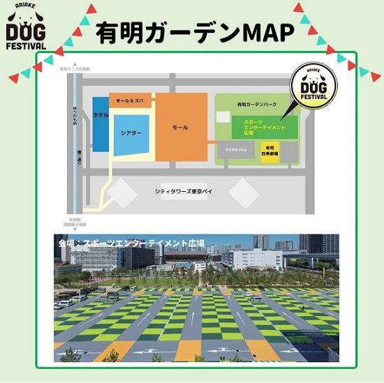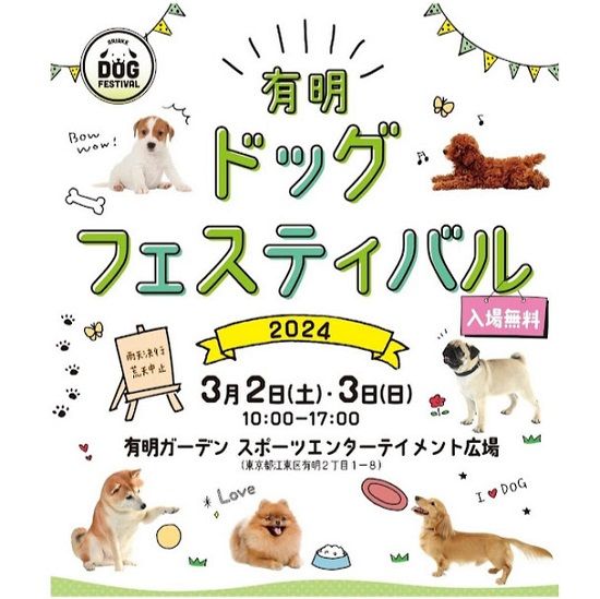 【有明ドッグフェスティバル2024】 ⽇程:2024年3⽉2⽇(⼟)・ 3⽇(⽇) 時間:10:00〜17:00 ⾬天決⾏(※荒天中⽌) 会場:有明ガーデン スポーツエンターテイメント広場 (東京都江東区有明2丁⽬1) ゆりかもめ「有明」駅 徒歩4分 ゆりかもめ「有明テニスの森」駅 徒歩3分 りんかい線「国際展示場」駅 徒歩6分 駐車場あり(ペット同伴で地下駐車場利用の場合は、Dエレベーター右箱を。立体駐車場は、Gエレベーター中央・右箱を利用しましょう) ⼊場料:無料 ※問合せ:有明ドッグフェスティバル事務局 https://wannaw.jp/ariake/ TEL:03-3668-2532(平日10時~18時)