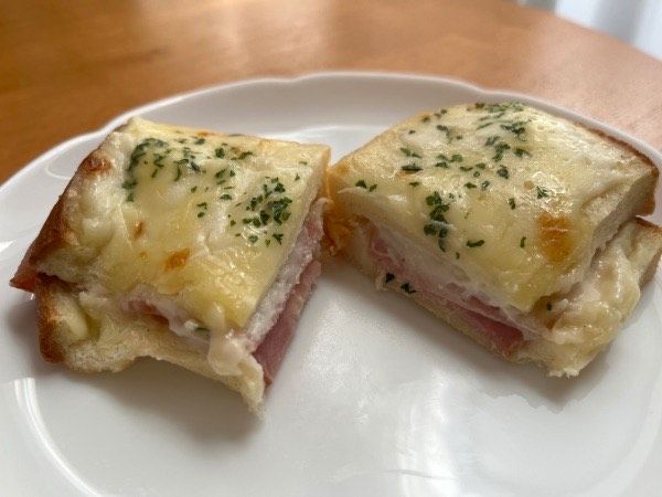 外の看板に本日のオススメ!として書かれてあった「クロックムッシュ」 大人気の食パンに自家製のベシャメルソースをたっぷりぬり、チーズ、ベーコンをはさみ、焼き上げてあります。ソースとチーズがとろっとろで美味しいです。 半分にカットしてみると、中の断面がキレイで早く食べたくなりました。