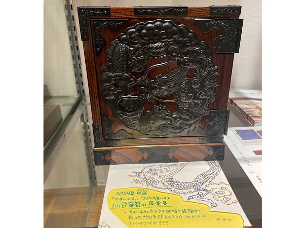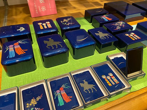 仙台生まれの漆芸である玉虫塗。よく見かける配色のほかに藍色がありました。 名刺入れや小物入れスタンドミラーなどがあり、仙台にちなんだモノが描かれています。