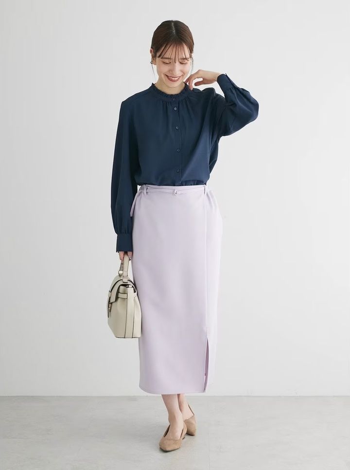 クールな雰囲気のカラーなので、あえてスカートなどの女性らしいアイテムを取り入れるのがおすすめ。