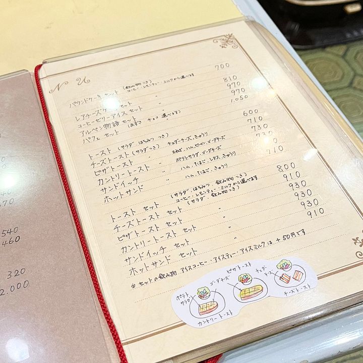 パァクの手書きのメニューはいつも魅力的で、ホットケーキを食べようと思っていてもついつい「カントリートースト」や「アルペン物語」に目が行ってしまう。食事もおやつもどれもおいしく、見た目も品があってかわいらしいのでとっても悩む。けれどきょうのお目当てはホットケーキだ。「お時間かかりますがよろしいですか?」もちろん。