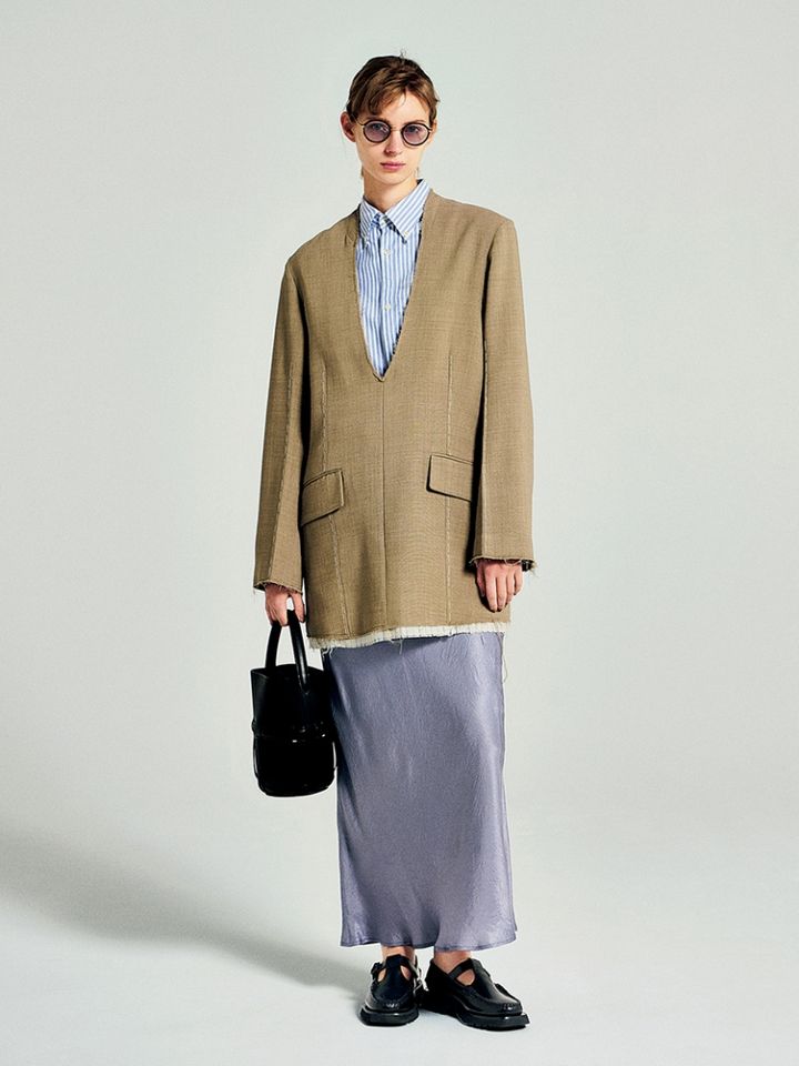 全体の引き締め役としていい仕事をしているのが、黒で統一したバッグとローファー。ベージュやブルーなど、あいまいな配色のスタイリングも自然と輪郭をもたらしてくれる。さらにトップスに合わせたのは、ジャケットみたいなプルオーバー。
