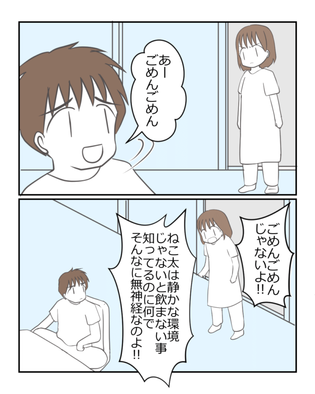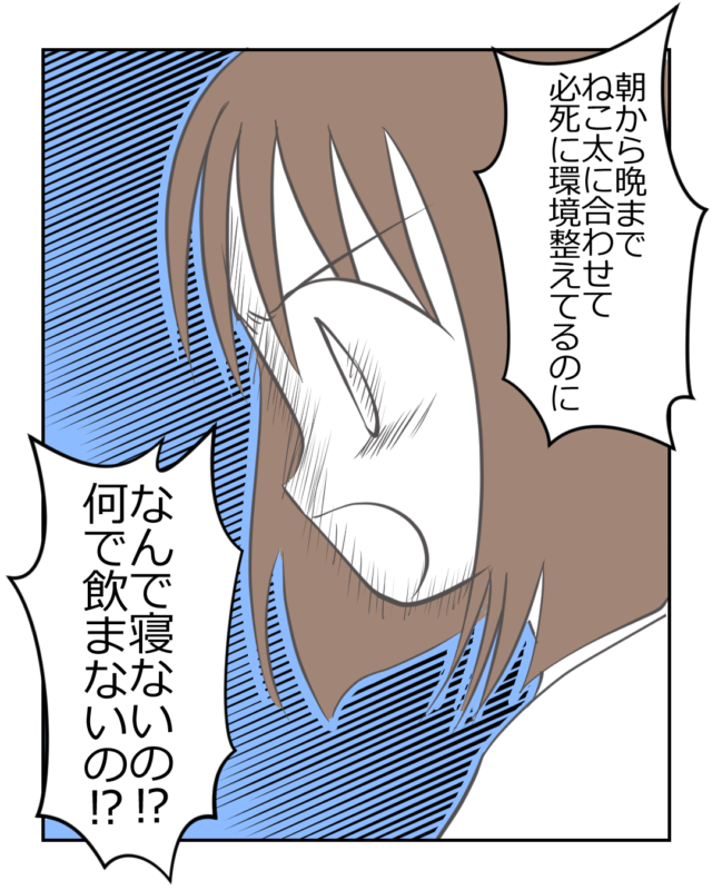 看護師さんからのアドバイスを実践するとミルクを飲んでくれたねこ太くん。「飲んだー!」と思わず喜んだとり子さんですが、周りの子と違いこんなにも神経を尖らせて授乳をしないと飲んでくれない状況に再び疑問が浮かびます。そのとき、目を覚まして遊び飲みを始めたねこ太くんを見て苛立ちを覚えたとり子さん。とり子さんの中で何かがプツッと切れて・・・気が付くと哺乳瓶を床に投げつけ「いい加減にしてよ!」と叫んでいました・・・。
