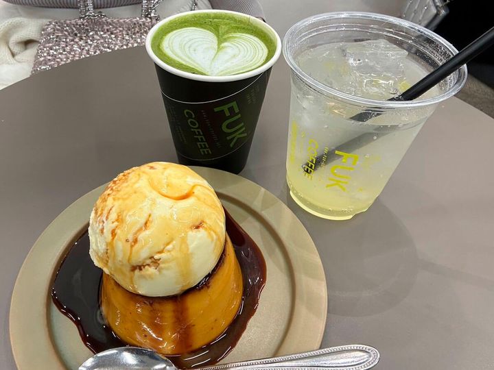大きめアイスと大好きな固めプリン! ハート型ラテも爽やかなレモンスカッシュも、とってもおいしかったです♡ ひと息つきたくなったら、みなさんもぜひFUK COFFEEへ行ってみてください♪