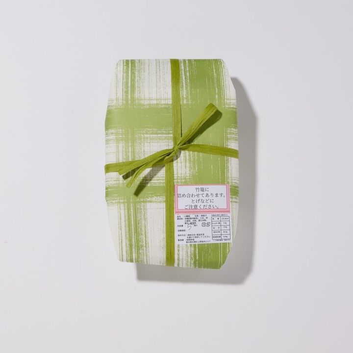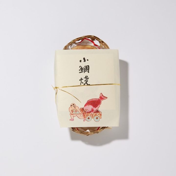 「笹の葉を彷彿とさせる包み紙を取ると、高級感のある竹篭に詰められた小鯛焼が。『鯛車』をひく童子のおめでたい掛け紙や、小鯛焼に添えられた檜葉も目を引きます」(児嶋さん)