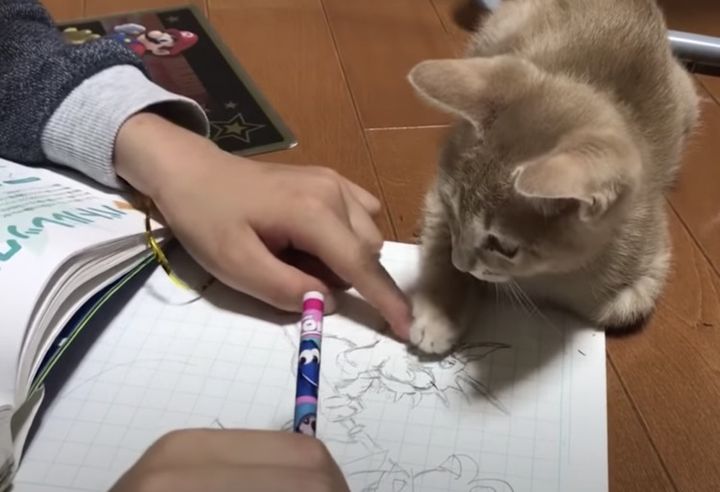 子猫「お絵かき楽しそうだにゃ〜」見学していたけれど、この後やっぱり我慢できなくなっちゃった!