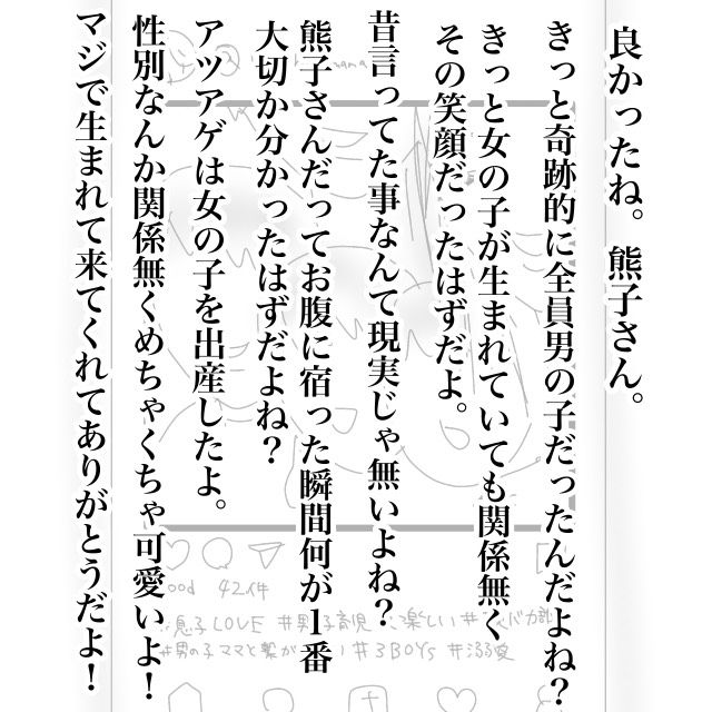 女の子は欲しくないと言っていた熊子さん、お子さんが全員男の子で本当に良かったですね。でも、生まれてきた我が子を見たら性別関係なくきっと熊子さんも愛しく思ったはず・・・。熊子さんが元気に幸せに暮らしていると良いですね。
