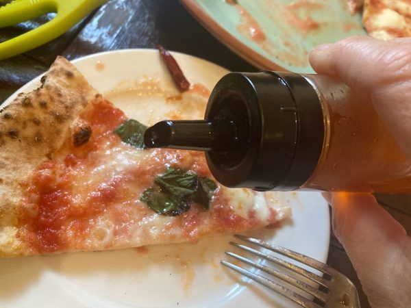 ピッツァ生地はもちもちしていて最高のお味!!自家製の辛い唐辛子オイルを少し加えていただくのもいいですね。