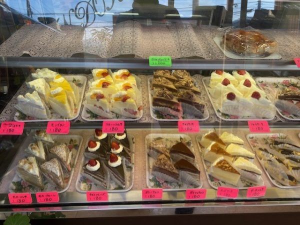 車はお店の前スペースに置けます。オレンジの建物がわかりやすい!入店すると正面はケーキのショーケースが。現金(小銭)の準備をお忘れなく入店くださいね。