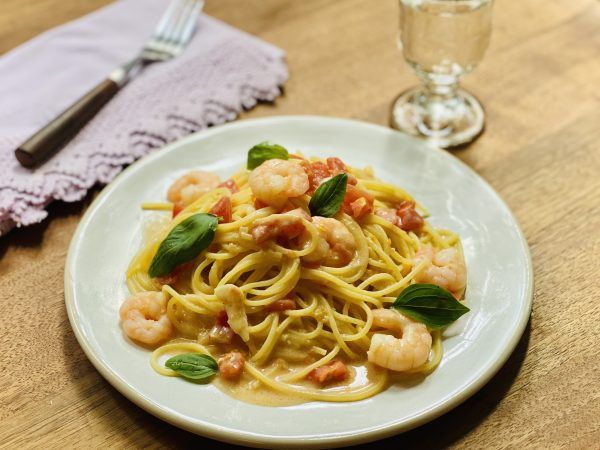 3.フライパンにオリーブ油、にんにくを入れ中火で炒め、にんにくがきつね色になったら、えびを炒めて、えびの色が変わったら、トマト、米糀ミルク、みそを入れて全体を混ぜ、一煮立ちしたら、茹で上がったパスタをあえる。皿に盛り、バジルを散らす