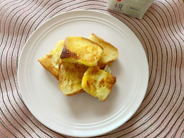 卵多めの割合で、低温でじっくり焼くのがポイント!わが家は、子どもたちがバゲットをあまり得意としないため、普通の食パンで作りました。