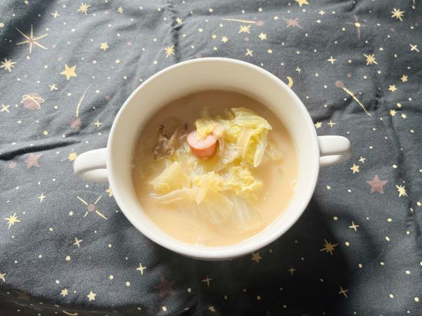 fumfumさんが使っていたのが、カリフローレと玉ねぎ、ベーコンでしたが、私は家にあった白菜、玉ねぎ、しめじ、ウインナーを使いました。残り野菜でパパっとできるので、夕飯のプラス一品にいいですね。米糀の優しい甘さが身体を温めてくれました。
