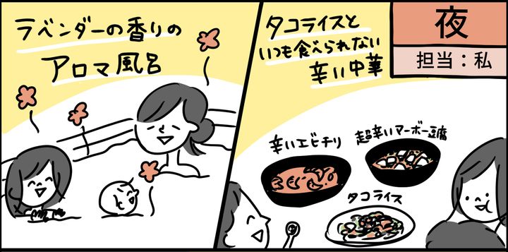 夕食は子どもにはタコライスを作り、そして大人たちは普段あんまり食べられない辛い麻婆豆腐と辛いエビチリを中華料理屋で買ってくることにしました。子どもが生まれてから辛いものは食卓に出せなくなったので、たまに食べたくなるんですよね。めっちゃ辛いやつ。